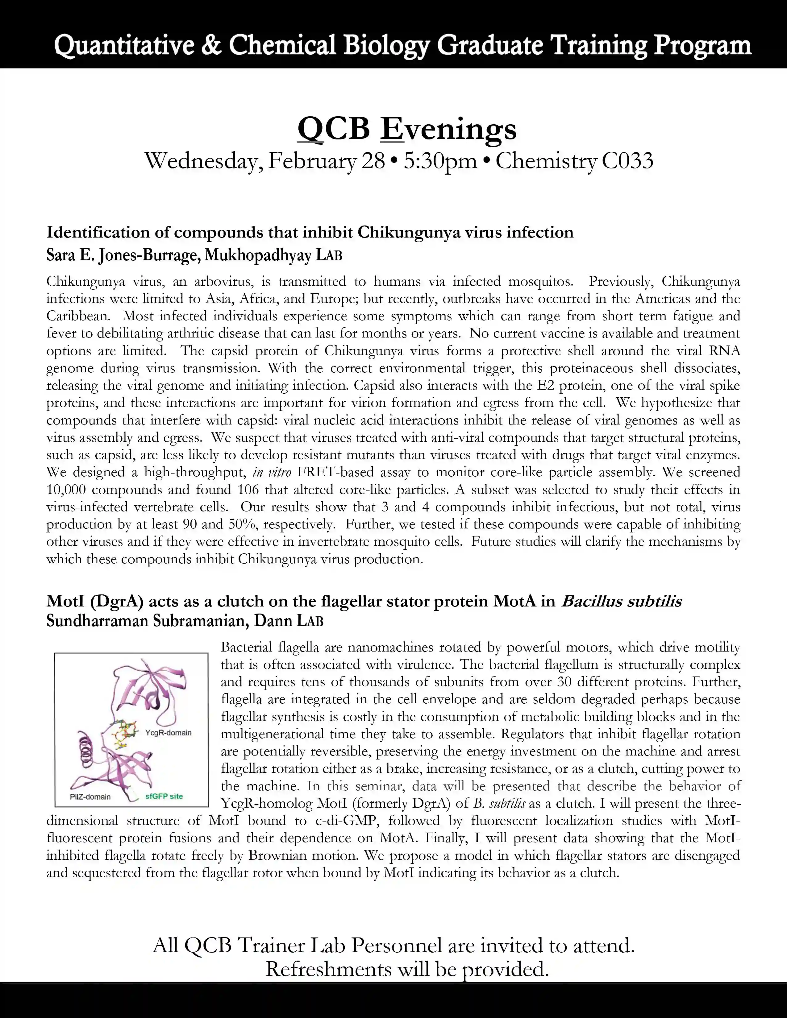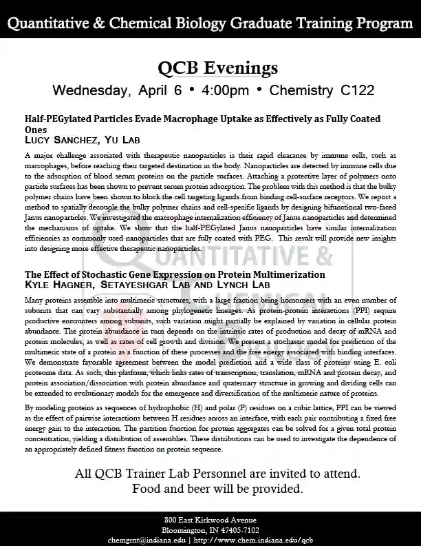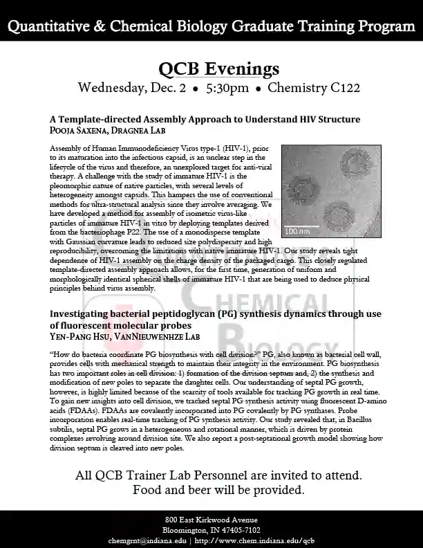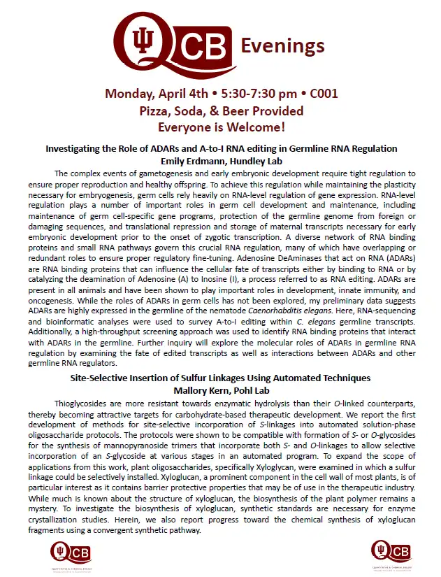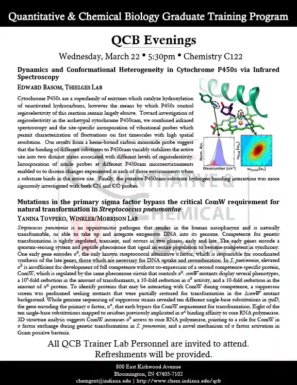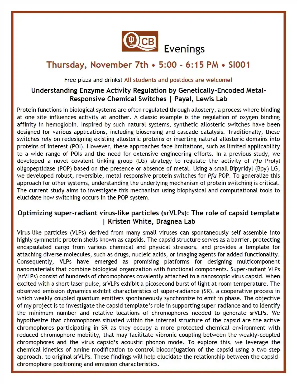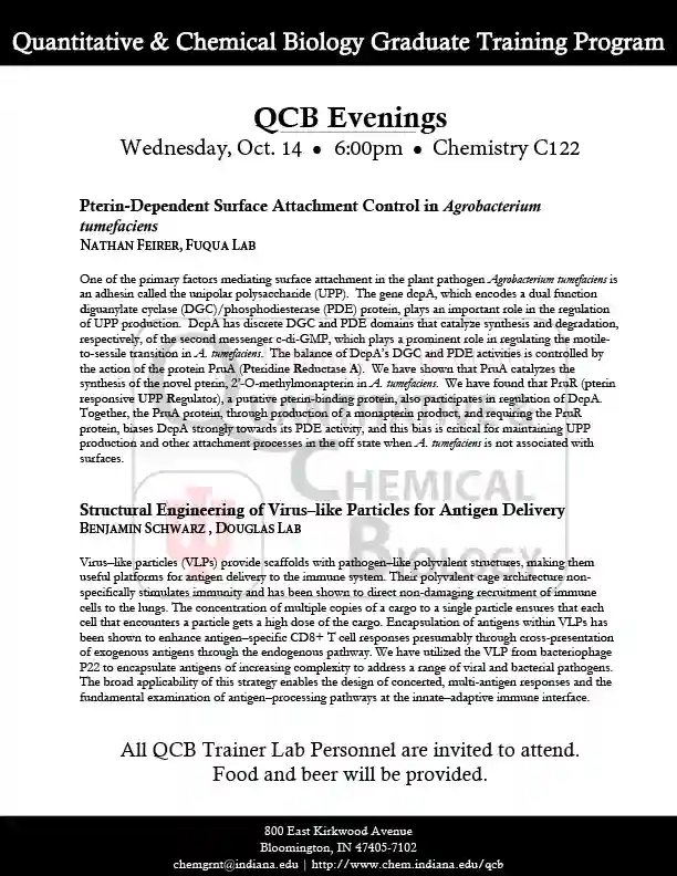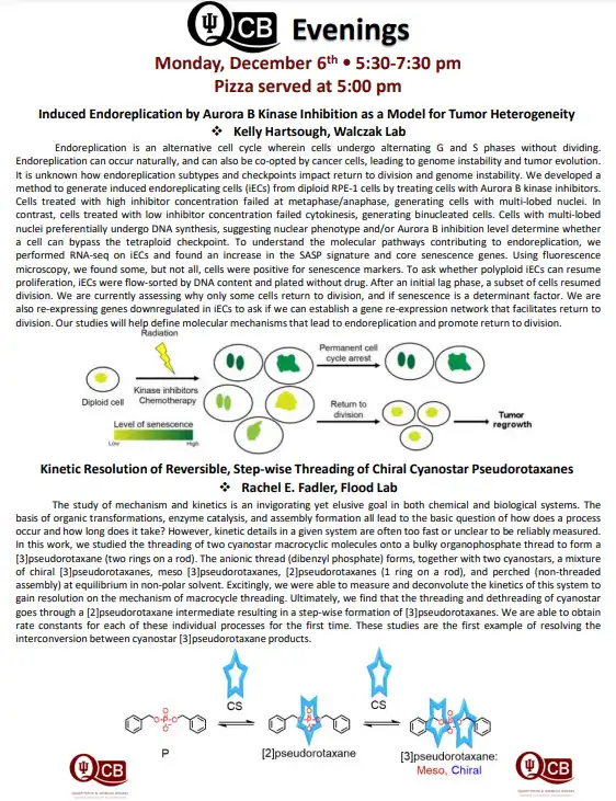 QCB Evenings meets five-six times per academic year, and features two 30-minute presentations by students or postdocs from QCB trainer laboratories. Dinner and refreshments are provided between the two presentations.