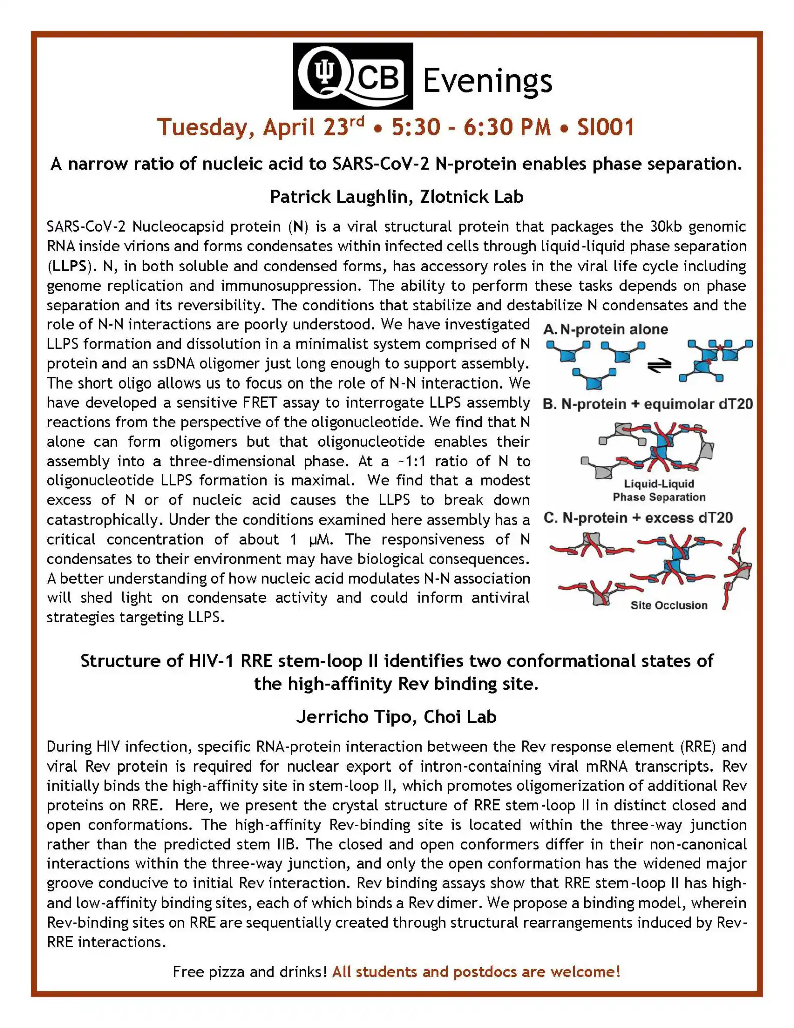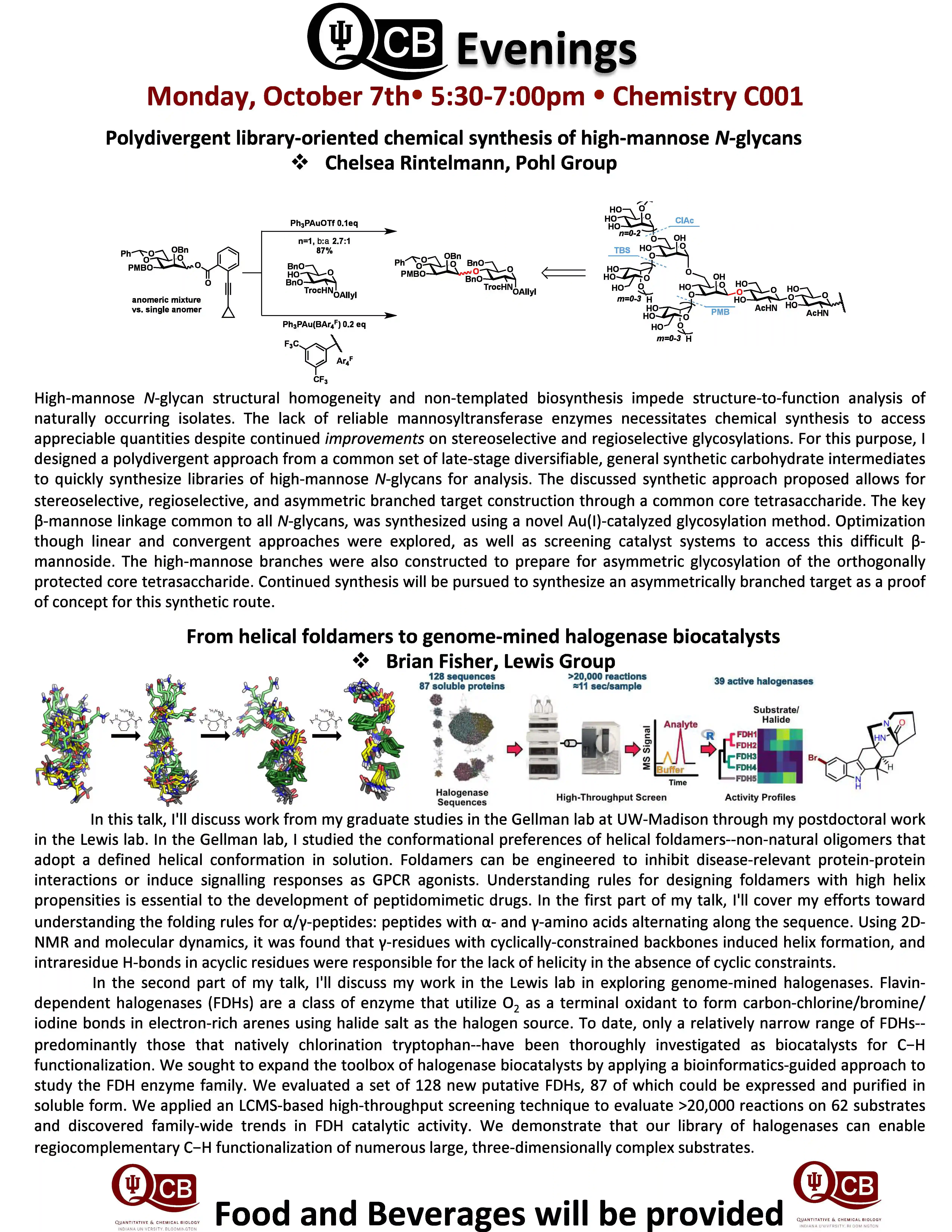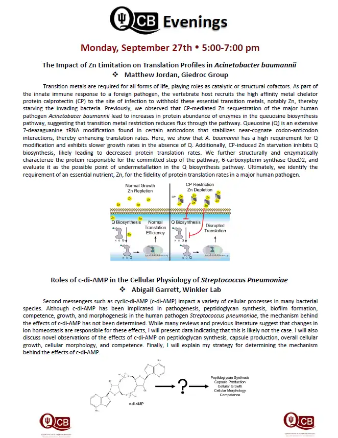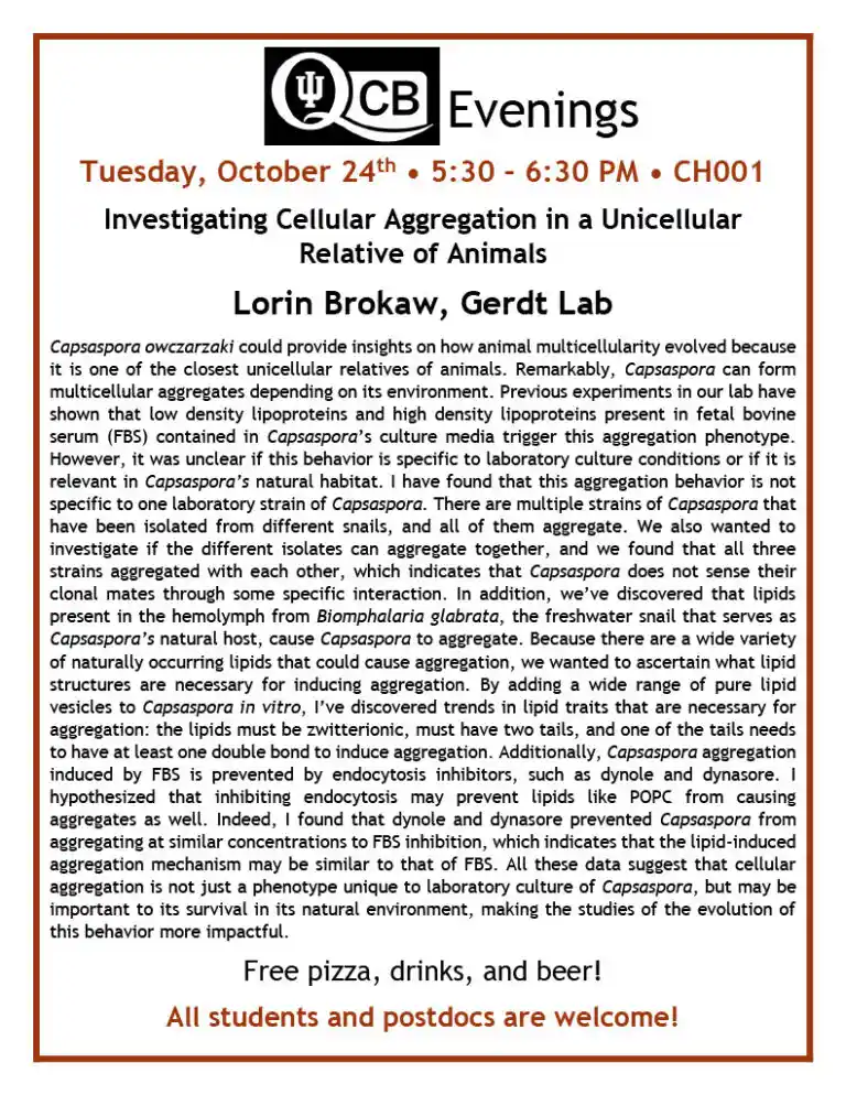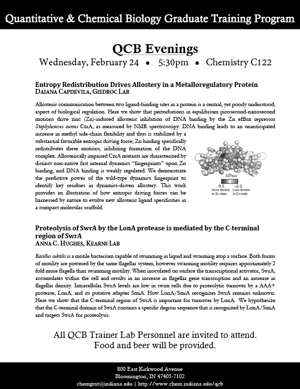 QCB Evenings meets five-six times per academic year, and features two 30-minute presentations by students or postdocs from QCB trainer laboratories. Dinner and refreshments are provided between the two presentations.