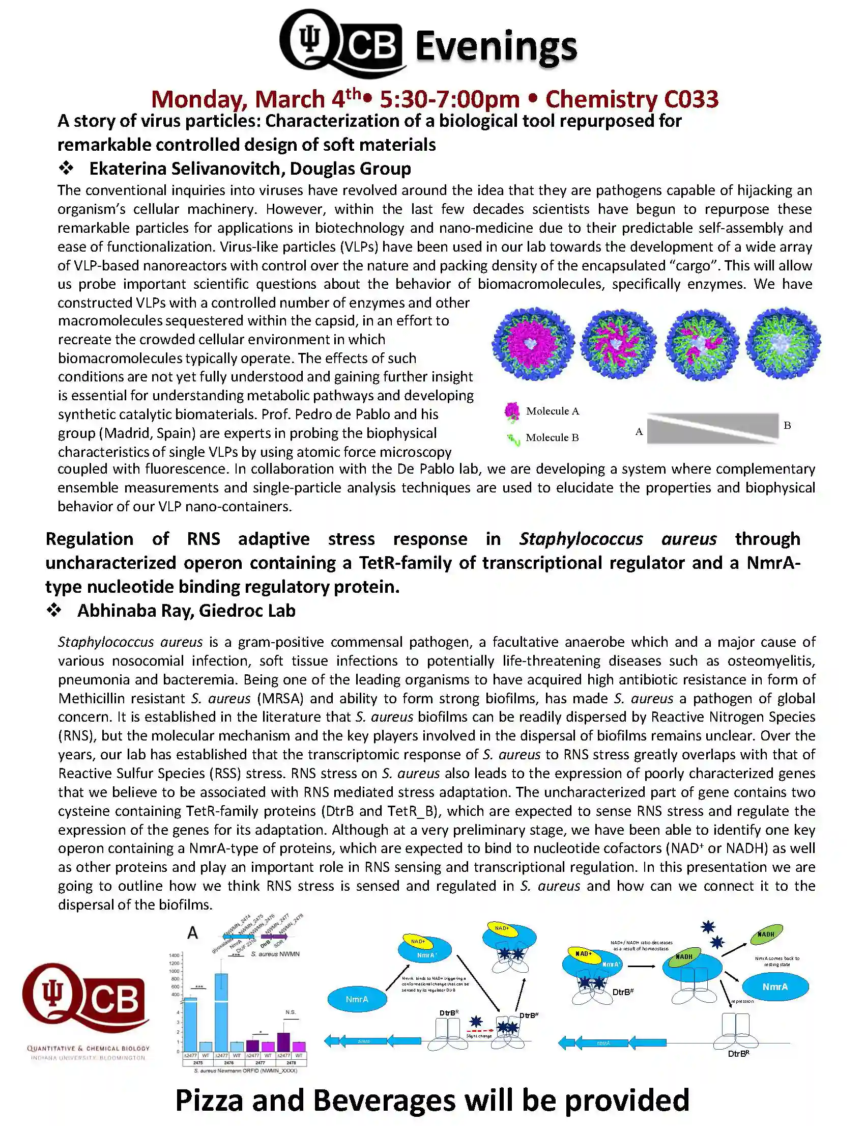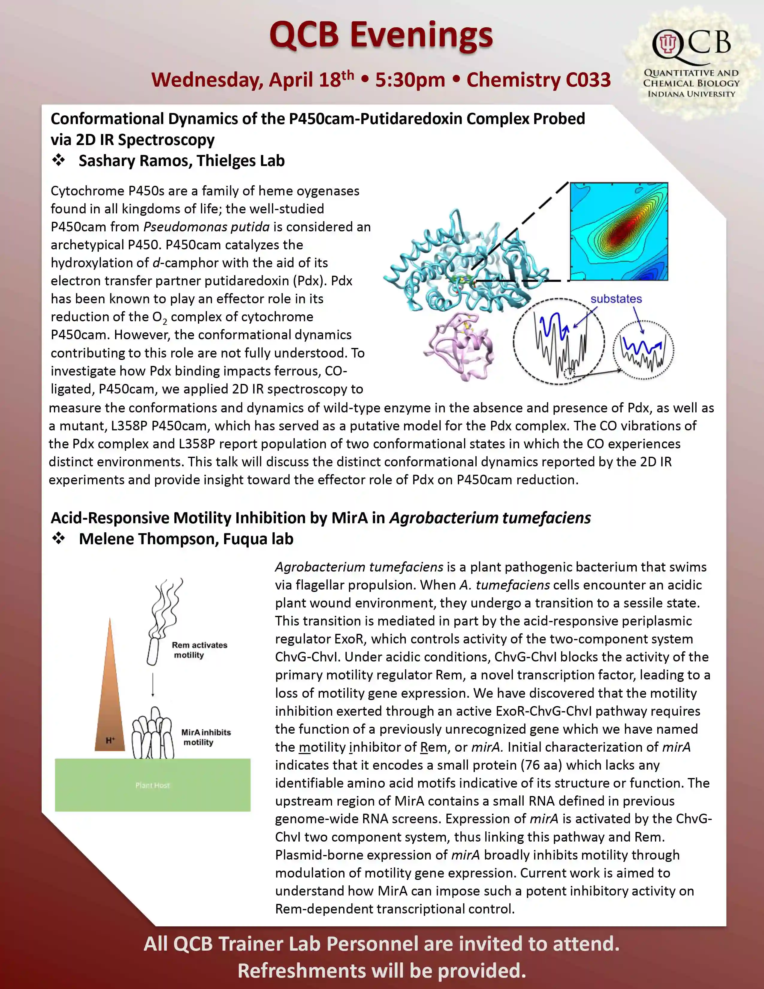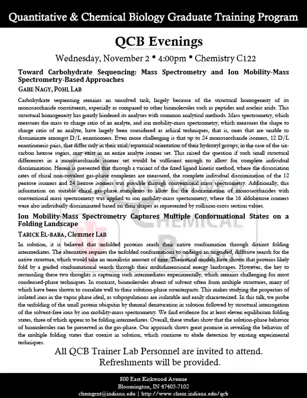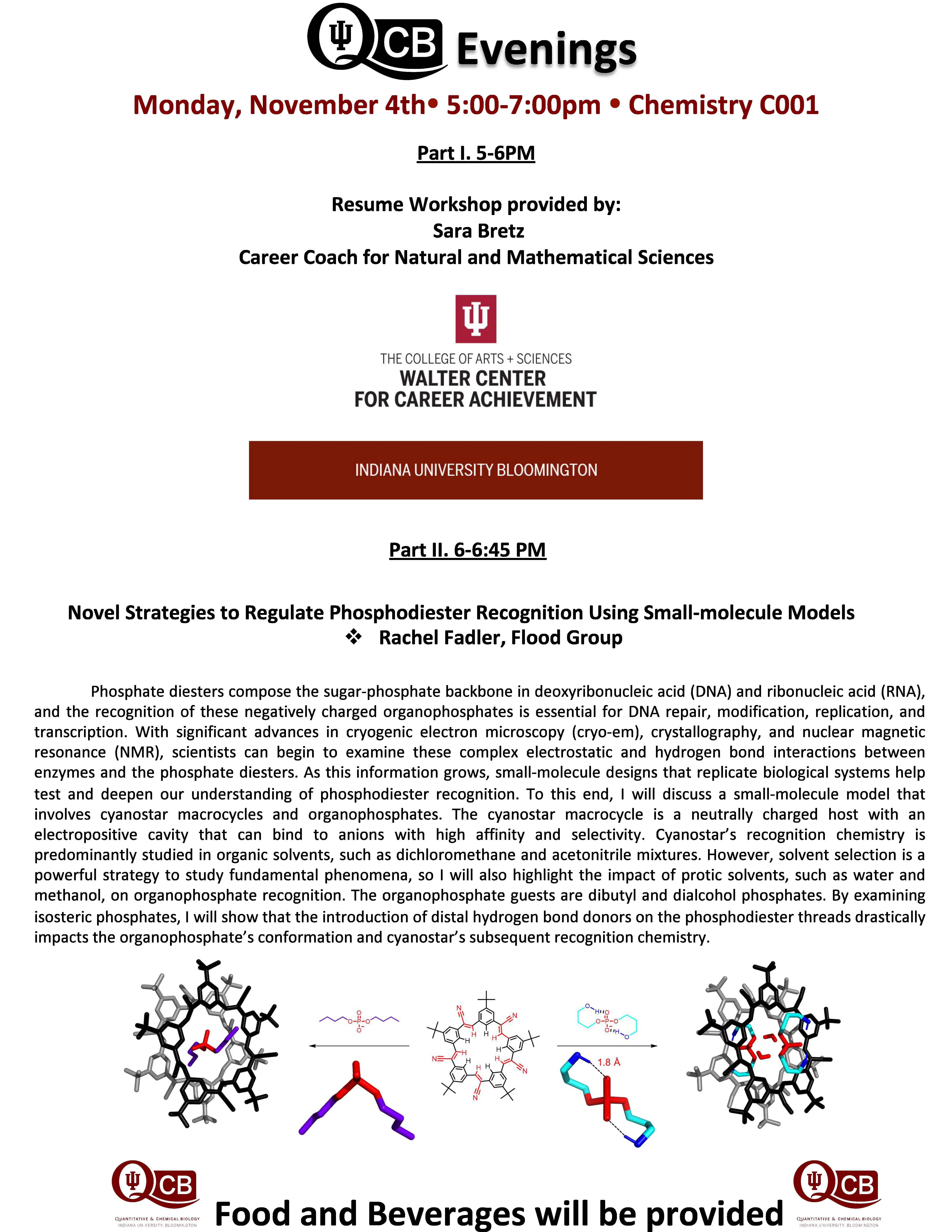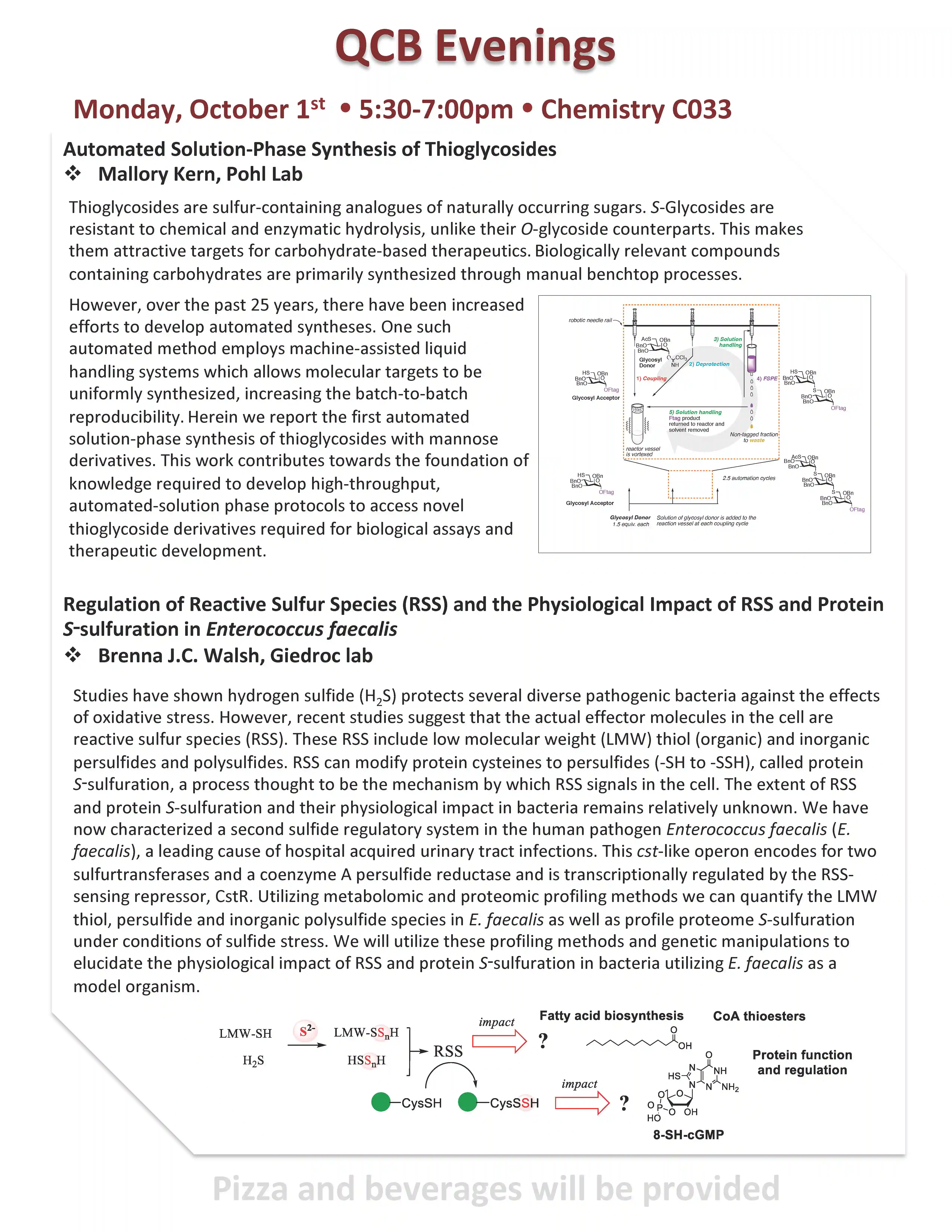 QCB Evenings meets five-six times per academic year, and features two 30-minute presentations by students or postdocs from QCB trainer laboratories. Dinner and refreshments are provided between the two presentations.