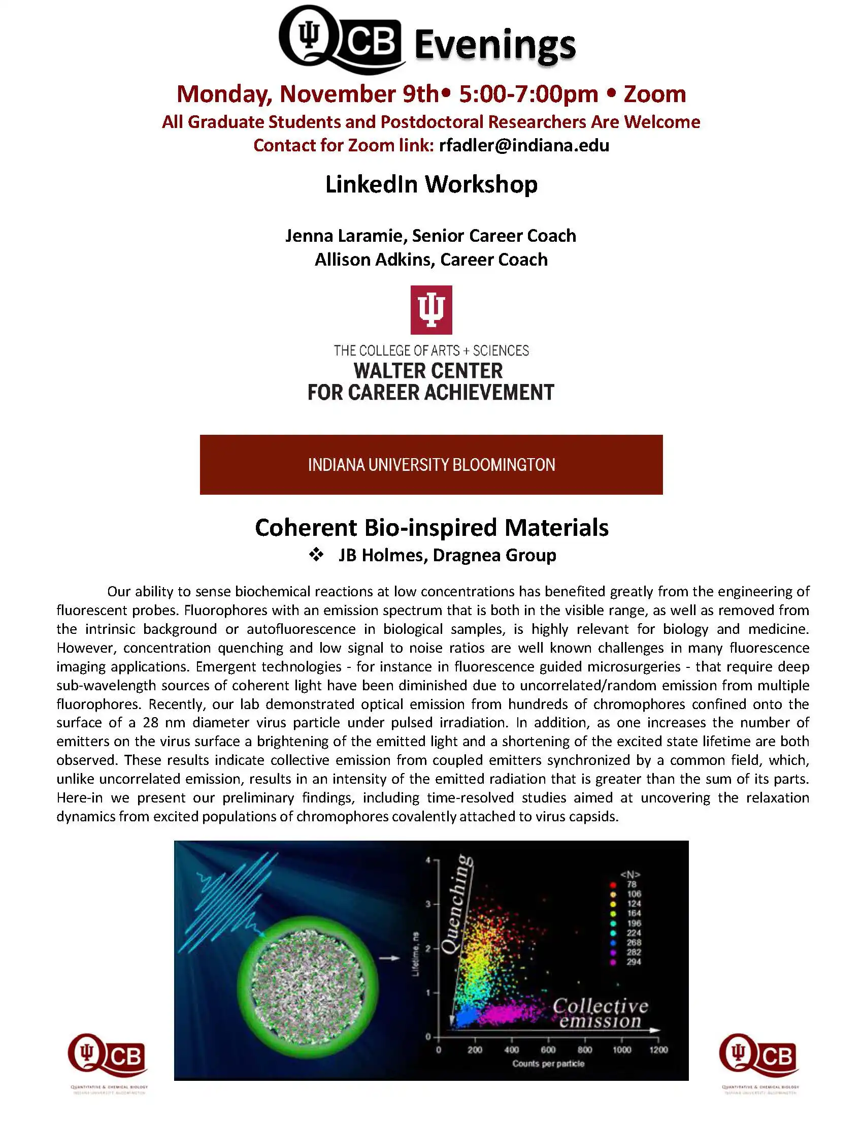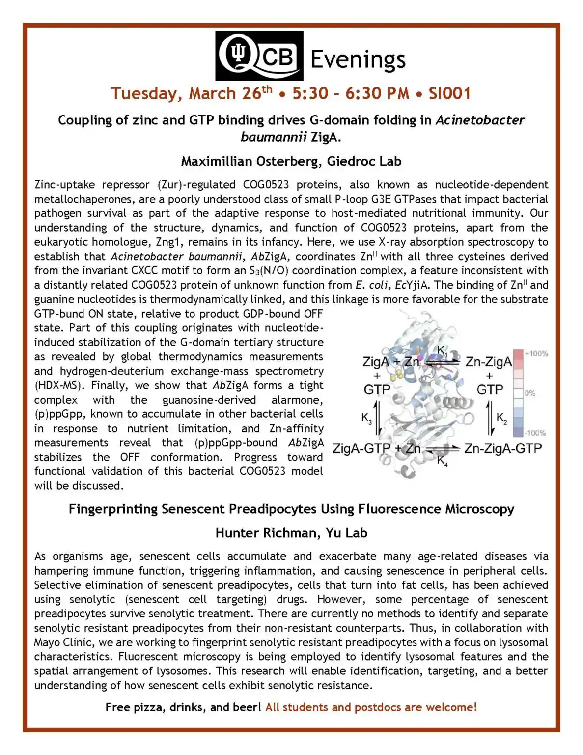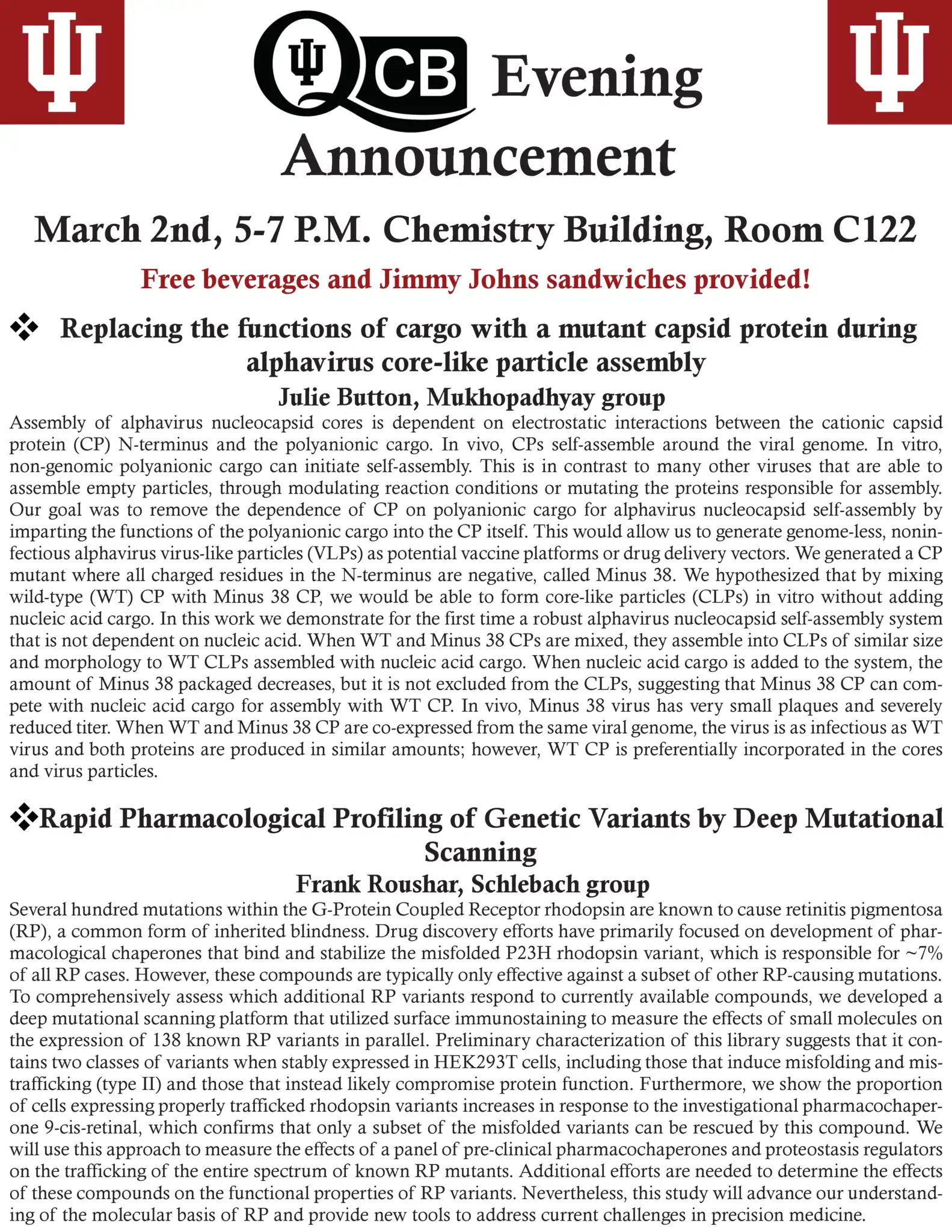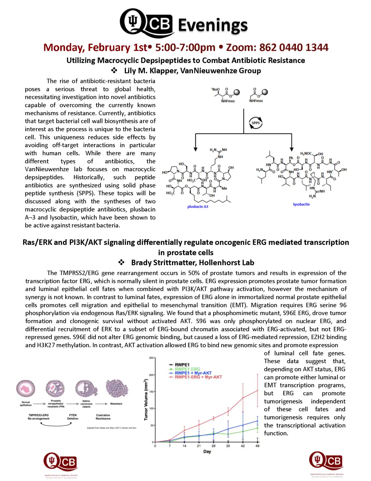 QCB Evenings meets five-six times per academic year, and features two 30-minute presentations by students or postdocs from QCB trainer laboratories. Dinner and refreshments are provided between the two presentations.