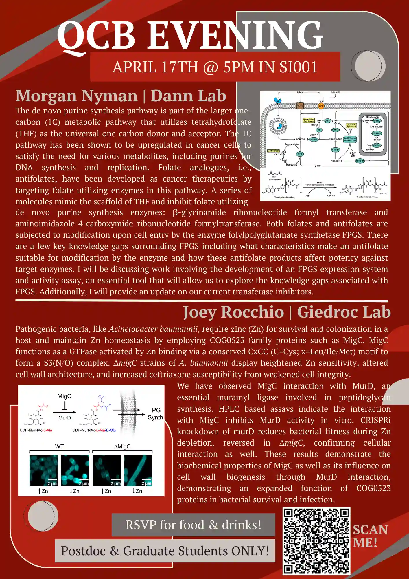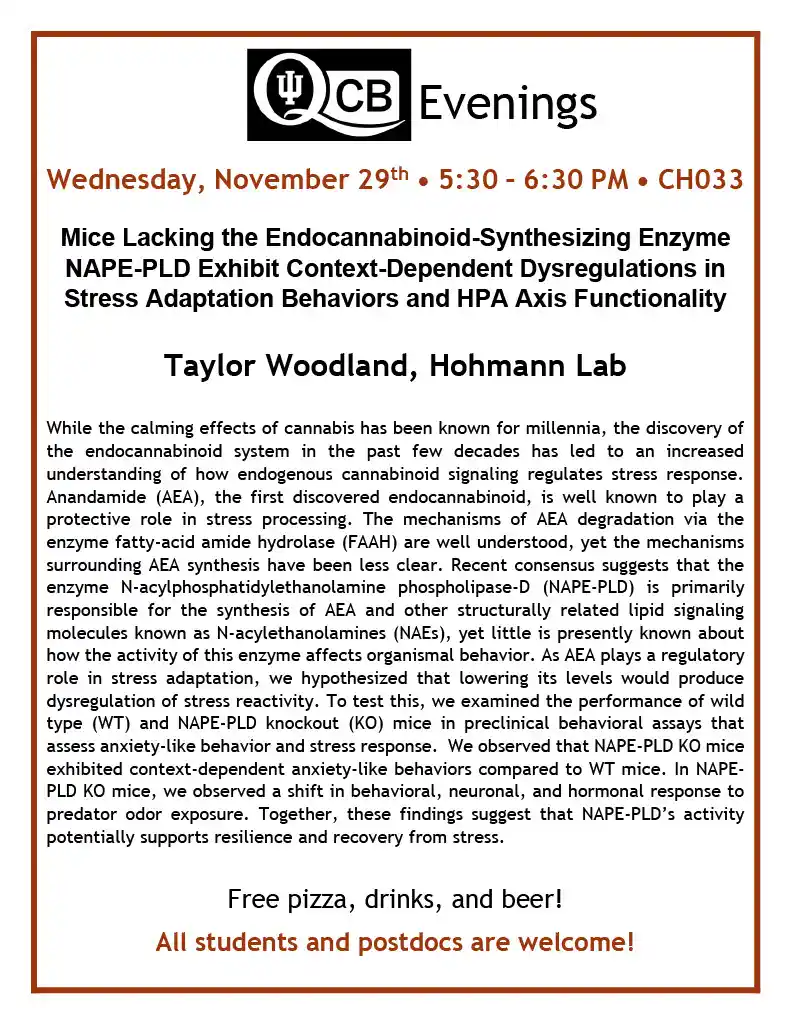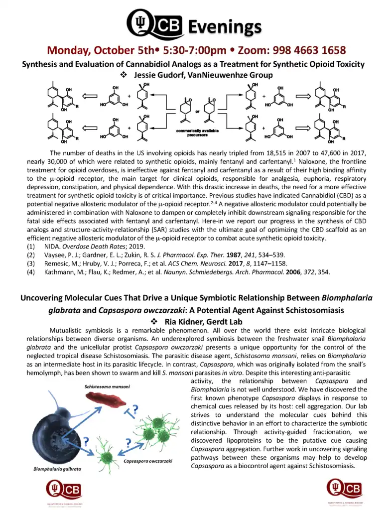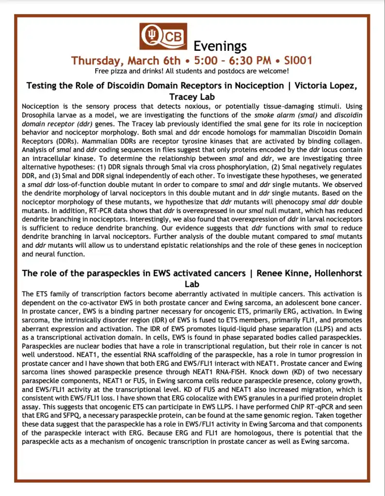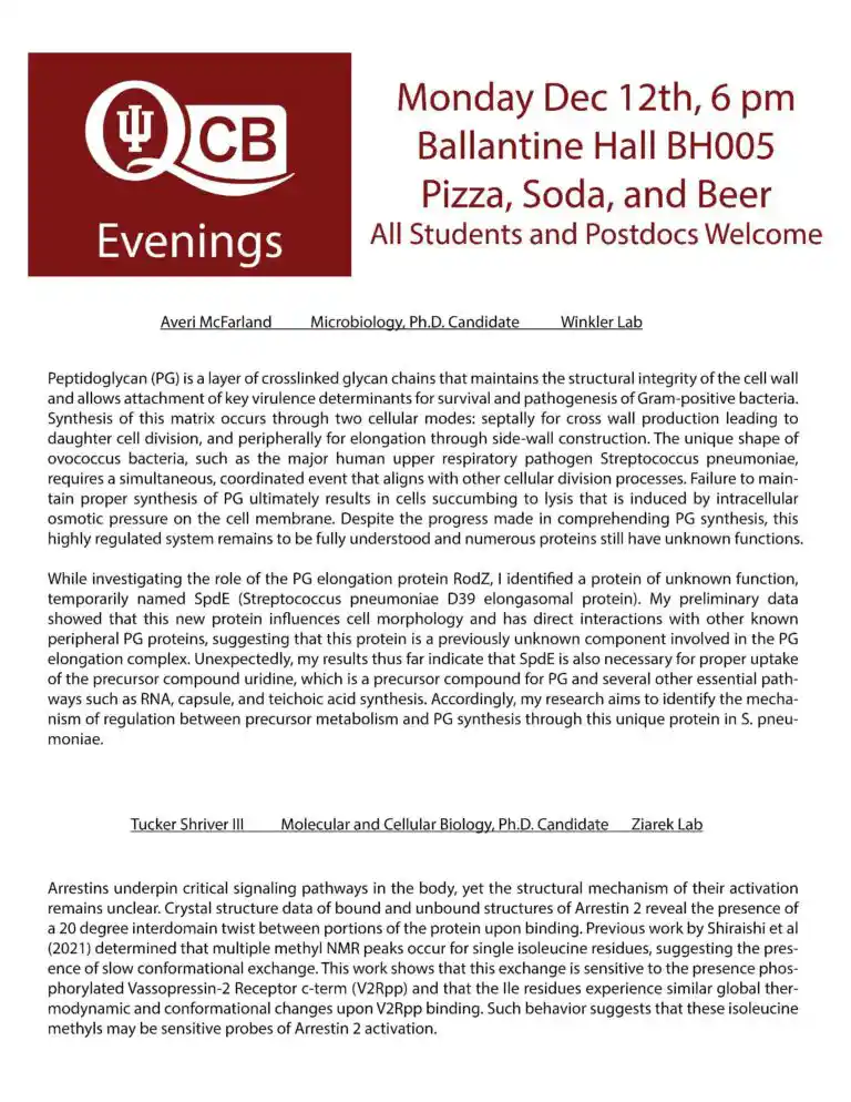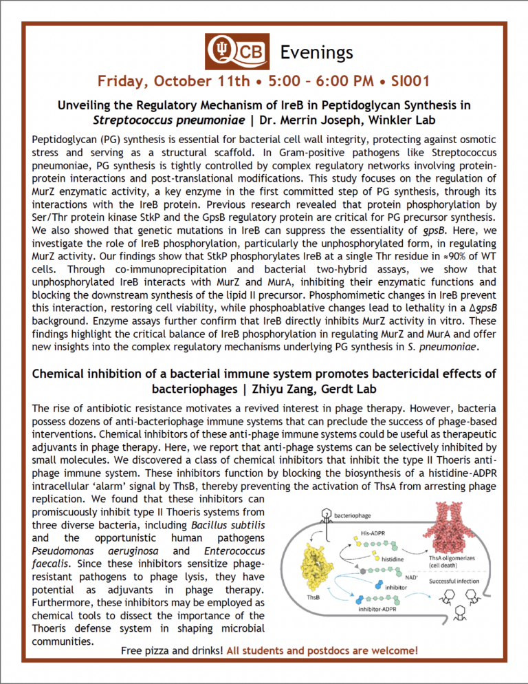 QCB Evenings showcases research from the entire QCB training program community, and is entirely organized and put on by the trainee cohort (training faculty not invited!).